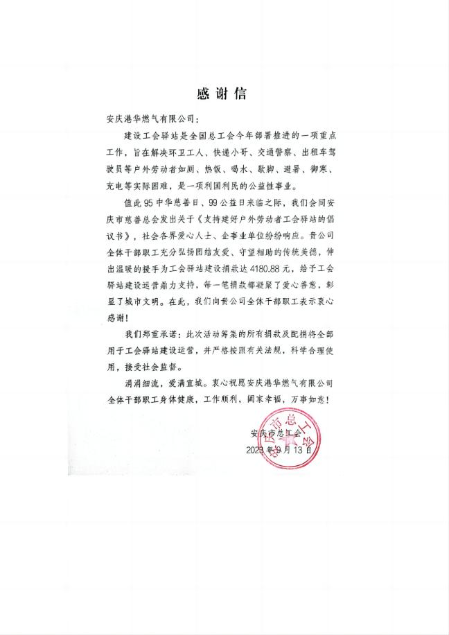 為進(jìn)一步傳播慈善文化,弘揚(yáng)傳統(tǒng)美德,推動戶外勞動者工會驛站建設(shè)。在全國第八個“中華慈善日”來臨之際,安慶港華高度重視,認(rèn)真部署,依法組織,在公司開展“慈善日捐款”活動。