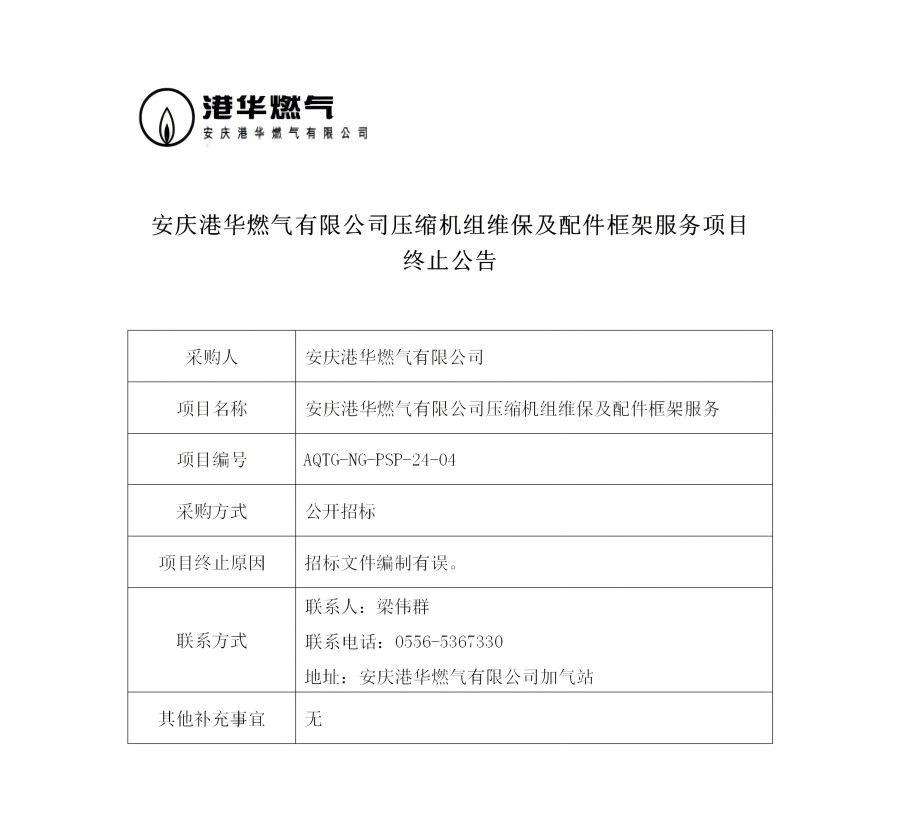 安慶港華燃氣有限公司壓縮機組維保及配件框架服務項目終止公告 發(fā)布時間:2024-11-13    閱讀次數(shù):3661次